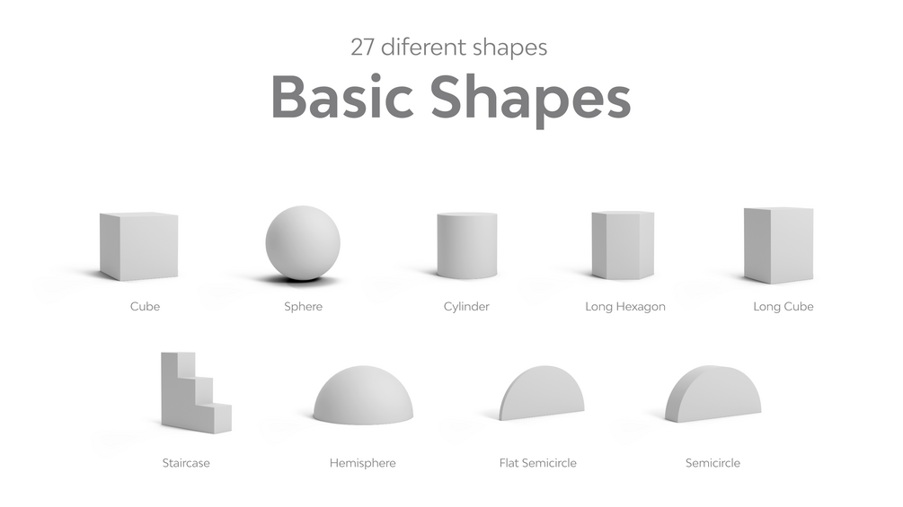 Basic Shapes include: Cube, Sphere, Cylinder, Long Hexagon, Long Cube, Staircase, Hemisphere, Semicircle and Flat Semicircle.